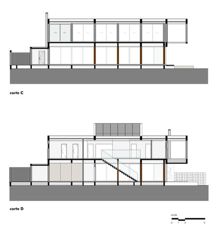O pavimento superior, que apoia-se sobre os planos em pedra do térreo resulta de um volume prismático em cimento queimado que contém painéis móveis em madeira que controlam a privacidade e opacidade dos dormitórios. A circulação íntimas tem a privacidade resguardada por brises verticais, que também controlam a insolação excessiva incidente sobre a fachada frontal.